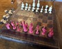 Maskované jako kniha v knihovně. Figurky červeně barvená kost a přírodní kost. Šachovnice z kůže, vše s patinou stáří! Ale to je právě to kouzelné!