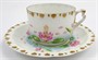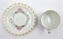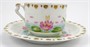 Bílý a barevně ručně malovaný a zlacený porcelán. Porcelánka Rosenthal. Šálek z bílého porcelánu s reliéfním věnečkem u horního okraje dekorovaný zlacením a ručně malovanými květy růžového lotosu s listy a úponky na vodní hladině. Stejný ručně malovaný dekor zdobí i podšálek s reliéfním žebrováním. Značeno zespodu: značka Rosenthal, název vzoru CARMEN, BAVARIA a značka malíře. Německo, Rosenthal 1898 - 1906. Výška šálku 5 cm, průměr podšálku 14 cm.