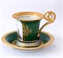 Bílý, malovaný, zlacený porcelán. V empírovém stylu. Ručně malovaná miniatura slavné baletky Carlotta Grisi v baletu Giselle. Carlotta Grisi ( 1819 - 1899 ): slavná chorvatsko italská baletka a tanečnice. Ručně malovaná postava baletky ohraničená zlatou kartuší na zeleném pozadí. Značeno zespodu: ručně černě napsané - Carlota Grisi, Giselle, Haas & Czjzek, Hand painted, monogram malíře L. K. , písmeno S a korunka. Zakázková ruční práce porcelánky Slavkov. Československo konec minulého století. Výška šálku 10,5 cm, průměr podšálku 16 cm.