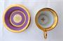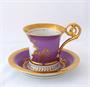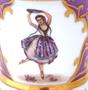Bílý, malovaný, zlacený porcelán. V empírovém stylu. Ručně malovaná miniatura slavné baletky Fanny Cerrito v baletu Alma z roku 1842. Francesca " Fanny " Cerrito ( 1817 - 1909 ) : slavná italská baletka a tanečnice. Ručně malovaná postava baletky ohraničená zlatou kartuší na fialovém pozadí. Značeno zespodu : ručně černě napsané - Fanny Ceritto, Alma, Haas & Czjzek, Hand painted, monogram malíře L. K. , písmeno S a korunka. Zakázková ruční práce porcelánky Slavkov. Československo konec minulého století. Výška šálku 10,5 cm, průměr podšálku 16 cm.