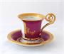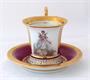 Bílý, malovaný, zlacený porcelán. V empírovém stylu. Ručně malovaná miniatura slavné baletky Marie Taglioni v baletu La Sylphide. Marie Taglioni ( 1804 - 1884 ): slavná švédsko italská baletka a tanečnice. Ručně malovaná postava baletky ohraničená zlatou kartuší na zeleném pozadí. Značeno zespodu: ručně černě napsané - Marie Taglioni, La Sylphide, Haas & Czjzek, Hand painted, monogram malíře L. K. , písmeno S a korunka. Zakázková ruční práce porcelánky Slavkov. Československo konec minulého století. Výška šálku 10,5 cm, průměr podšálku 16 cm.