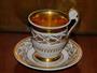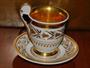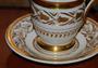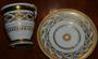 Šálek s podšálkem, bohatě zlacený, porcelán, výška 11,5 cm. Šálek bez značení, podšálek značen vrypem, špatně čitelně, zalito glazurou. Značka vypadá jako G a šipka, nebo psací velké P, nejde nafotit. Otřelé zlacení používáním, jinak perfektní stav. Pravděpodobně 1. pol. 19. stol., Karlovy Vary a okolí (Slavkov, Kysibl, atd.) Stejný tvar vyráběll Slavkov před rokem 1830.