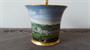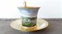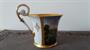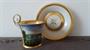 Luxusní empírový šálek, bílý fond se zlatem malovanými hvězdami, malovaná veduta krajiny s klášterem a postavami, císařská manufaktura Vídeň, výška šálku 10,2 cm, značeno tlačeným štítem a letopočtem 1837, podšálek malovaný identickou zlatou hvězdou, průměr 14,5 cm, značený modrým podglazurním štítem a letopočtem 1817. Výborný stav.