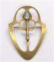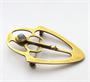 Stará secesní brož ze zlaceného 900 stříbra s centrálním malým mondsteinem, puncováno 900 a český punc (zajíc s 3), značka neidentifikovaného německého šperkaře BE (?) a nápis “vergoldet” (viz fotky). Rozměry 5,3 x 3,6 cm, průměr kamene cca 6 mm, váha stříbra 8,3 g, celkem 8,75 g, dobrý stav bez poškození, běžné známky stáří a používání, uzávěr v pořádku. Ryzost a váha potvrzeny puncovním úřadem.