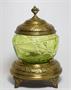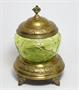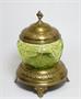 Půvabná secesní skleněná dóza v kovové montáži z mosazného plechu stojící elegantně na třech nožkách se stylovým ornamentem po celé ploše. Dekorativní třídílná dóza z období Belle Époque kolem roku 1900 je vynikající uměleckořemeslná práce, sklo dekorované zlacením je pravděpodobně dílem sklárny PALLME - KÖNIG, popř. krystalerie RINDSKOPF. Dobrý stav, rozměr - v. 20cm, prům. 15cm