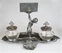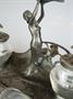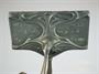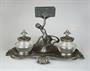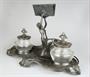 secesní figurální kalamář se skleněnými nádobkami, kovová postříbřená kompozice, na držáčku na papíry ve tvaru knihy nečitelný (fiktivní, těsnopisný?) text s datací r. 1903, vyrobila vídeňská firma Albert Köhler & Cie (AK & Cie), dceřiná společnost významné německé firmy W.M.F; rozměr 36 x 21 x 21 cm; původní nálezový stav