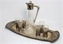 Luxusní likérová souprava z umělecké slévárny Franz Bibus & Sohn z Moravské Třebové, firmu založil Franz Josef BIBUS ( *1860 +1941). Souprava na tácku s jemný lemováním z drobných kuliček a krásnou karafkou s odklápěcím víčkem je z postříbřené alpaky, kalíšky jsou z čirého skla. Tácek stojí na čtyřech čočkovitých nožkách a má vespod značku - vlajku s písmenem B ( viz posl. foto ). Půvabná uměleckořemeslná práce z počátku minulého století ve stylu geometrické secese. Dobrý stav, rozměr - karafa v. 23 cm, frťánek v. 7,5cm, podnos š. 41 x 16 x 3cm