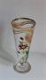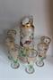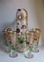 Nápojová souprava, džbán a šest sklenic na noze. Čiré sklo, matované, transparentně malovaný květinový dekor, zlacení. Drobné kazy ve sklovině, zlacení místy otřelé. Džbán výška 35 cm, číše výška 18,5 cm. Kol 1910.