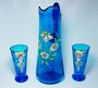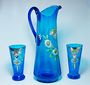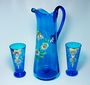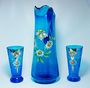 Secesní džbán a pár sklenic dekorovaný vypalovaným smaltem a zlacením, ručně malovaným ornament květin a zvonků. Uvnitř kobaltově modrého skla je optické hranování, vespod je broušená čočka po heftu od sklářské píšťaly. Půvabná sklářská práce z počátku minulého století, dobrý stav, rozměr džbán - v. 32cm, š. 18cm, sklenice - v. 15cm, prům. 7,5cm