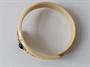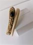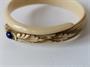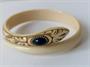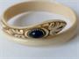 Náramek z materiálu věrně napodobujícího slonovinu (patrně na bázi kaseinu) s ozdobně vyřezávanou hlavou s modrým kamenem, průměr náramku 7 cm. Dobový šperk.