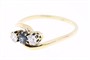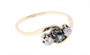 Jemný prsten v secesním stylu, vyrobený ze zlata ryzosti 565/1000, s kameny zasazenými do zlata ryzosti 585/1000. Dominantou prstenu je centrální safír o hmotnosti přibližně 0,10 ct, po jehož stranách jsou zasazeny dva brilianty o celkové hmotnosti přibližně 0,18 ct.