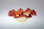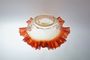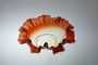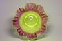 Krásná miska ve tvaru květu z uranového skla se silným luminiscenčním efektem, přecházející v horním okraji do starorůžového opálového skla. Uranové jadro má optický dekor a lemování misky je hutně tvarované do mnoha jemných vlnek. Vespod je broušená čočka po heftu od sklářské píšťaly. Čechy po roce 1900, snímek č. 1 a 2 je focený pod UV lampou. Dobrý stav, rozměr - prům. 17cm, v. 7cm
