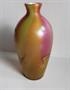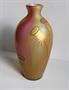 Skleněná váza tykvovitého tvaru, s úzkým hrdlem. Na bílém emailu střídavě červené, zelené a žluté pastelové pruhy, vrstvené čirým sklem. Povrch lehce irizován a zdoben zlatou malbou s motivem bodláku. Oblíbená technika několika skláren pod obchodními názvy Tricolor, Rainbow. Kol 1900. Výška 22,1 cm.