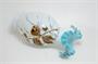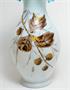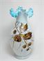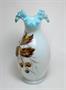 Půvabná hutně tvarovaná váza z jemného opálového skla, které je kolem vlnkovaného hrdla podjímané akvamarínovou sklovinou a je zušlechtěná ručně malovaným florálním ornamentem. Vespod je heft od sklářské píšťaly, práce z konce 19. století, pravděpodobně sklárna Nový Svět Harrachov, nebo krystalerie na Novoborsku. Dobrý stav, rozměr - v. 27cm, prům. 13cm