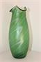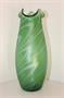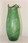 Zelené sklo, foukané do konkávní formy, opředené bílou nití, s diagonálně protaženým dekorem, zapálený okraj vytažený do tří špiček, zabroušené dno. Nitě jsou konturovány zlatem, místy otřelým. Výška 20,5 cm, průměr ve středu těla 8,5 cm. Výrobce neurčen. Kol 1898