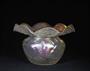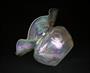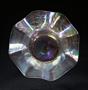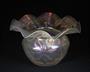 široká secesní váza s výrazně kanelovaným okrajem, čiré lehce irisované sklo s efektním plastickým dekorem ze zatavených květů z čirého skla, Raousko-Uhersko, Čechy, Harrachov (Neuwelt), kolem r. 1910, průměr 18,5 cm, výška 11,5 cm; sběratelsky zajímavé