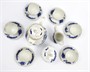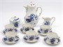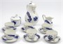 Bílý, ručně kobaltově malovaný a zlacený porcelán. Ve stylu porcelánky Míšeň. Karlovarský porcelán, závod Dubí. Moka servis složený z kávové konvice, konvičky na mléko, cukřenky a 6 šálků s podšálky. Bílý porcelánový servis s ručně kobaltovou modří malovanými čínskými draky doplněný o zlacené a červené ornamenty. Horní úchyty zdobené reliéfními květy. Kompletní kávový servis ve vynikajícím stavu. Značeno zespodu: značka výrobce, CZECHOSLOVAKIA, HAND PAINTED. Československo, Dubí, druhá polovina minulého století. Výška konvice 20 cm, výška konvičky na mléko 9 cm, výška cukřenky 9 cm, výška šálků 4 cm, průměr podšálků 10,8 cm.