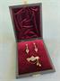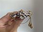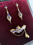 Zlatá brož se dvěma ověsky ve tvaru tzv. "Lover´s knot", typického právě pro romantismus a období biedermeieru: Au 585/1000, modrý a bílý email bez známek jakéhokoliv poškození či chybějících částí, šířka 52 mm, osvědčení Puncovního úřadu, top stav. Hmotnost 9,0 g.