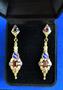 Zlaté náušnice: Au 585/1000 a 550/1000, modrý a bílý email bez známek jakéhokoliv poškození či chybějících částí, almandiny a perličky, délka 62 mm, osvědčení Puncovního úřadu, top stav. Hmotnost 3,0 g