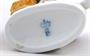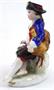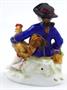 Bílý, barevně ručně malovaný a zlacený porcelán. Porcelánka Sitzendorf. V rokokovém stylu. Porcelánová soška sedícího chlapce v modrém kabátě a černém klobouku. Levou rukou přidržujícího kohouta, pravou ruku položenou na košíku s růžemi.V dolní části reliéfní růže na oválném rokokově tvarovaném podstavci. Značeno zespodu: písmenem S a korunou. Německo, Sitzendorf, od roku 1918. Výška 7,5 cm, šířka 6,5 cm.