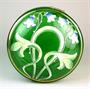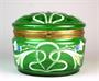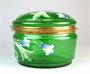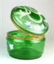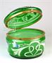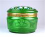 Dóza ze zeleného skla malovaná vstveným emailem, kovová montáž. Počátek dvacátého století.