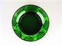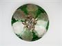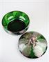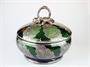 skleněná mísa s víkem s úchytkou ve tvaru květiny z ryzího stříbra, tmavě zelené sklo zdobené stříbrnou galvanoplastikou, signováno vyrytým AJ arte, západní Evropa, kolem r. 1940, Ag btto 1366,90 g/999/1000, výška 17 cm, průměr 20 cm; atest Puncovního úřadu
