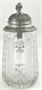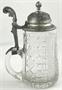 Bezbarvé broušené sklo, cín. V historizujícím stylu. Korbel klasického tvaru z bezbarvého broušeného skla. Zdobený svislými pásy ve střídavé kombinaci kaménkového brusu, čtverců s křížky, kosočtverci s jemným brusem.. Klenuté cínové víčko ve tvaru kopule zdobené reliéfním ornamentem. Florálně tvarovaný úchyt. Čechy 1890 - 1940. Výška 19,5 cm.