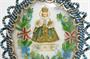 Obrázek Pražského Jezulátka vložený pod vypouklé sklo a bohatě dekorovaný množstvím drobných skleněných korálků, práce z 19. století pocházející z Jizerských hor k zavěšení na stěnu. Vespod je nápis J. H. S. ( Jesum Habemus Socium - Ježíš je náš společník ). Pražské Jezulátko pochází ze Španělska z poloviny 16. století a podle legendy svatá Terezie zakladatelka Řádu bosých karmelitek sošku darovala přítelkyni, jejíž dcera cestovala do Prahy. Dobrý stav, rozměr v. 19 x 16 x 2cm