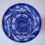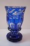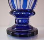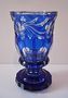 Sklo bezbarvé přejímané kobaltovým sklem.Kulatá hraněná patka s prstencem.Úzký fazetovaný dřík na hoře s probrušovaným prstencem.