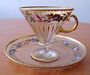 Šálek s talířkem z tenkého skla, ruční malba. Signováno zespodu rytím H 890 Q. Šálek výška 8,5 cm, talířek průměr 16 cm. Bezvadný stav.