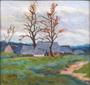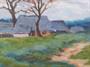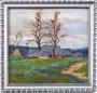 Olej na plátně fixovaném na kartonu 32 x 34 cm. Signováno vlevo dole. Vzadu na kartonu přípis tužkou : Ves Kameničky na Českomoravské vysočině. Stříbrný rám, s ornamentem vejcovce a perlovce, 38 x 39,5 cm.