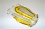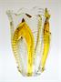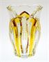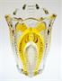 Velmi masivní a bohatě brusem zušlechtěná prvorepubliková váza z čirého skla, které je dekorované ambrovou lazurou. Váza má velice plastický reliéf, který musel být při výrobě z velké části ručně odbroušen a celé ploše dominuje geometrický ornament, hrdlo je broušením tvarováno do špiček, síla stěny skla je místy 2cm. Solitér ve stylu ART - DECO, dobrý stav, rozměr v. 24cm, prům. 16cm, hmot. 2,8kg