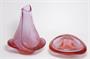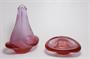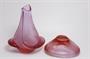 Souprava z hutního skla s povrchovou strukturou v odstínu Royalit, které mění barvu v závislosti na spektru osvětlení. Váza s nálepy a popelníček z masivního hutního skla ze 60tých let s méně vídaným odleptávaným dekorem. Soupravu navrhl sklářský výtvarník František ZEMEK ( *1913 +1960 ) provedly sklárny ŽBS v Železném Brodě. Dobrý stav, rozměr - váza v. 20 x 14 x 10cm, popelník prům. 14cm, v. 6cm