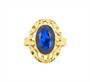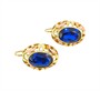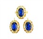 Elegantní set šperků ze zlata ryzosti 585/1000 s tmavě modrými syntetickými spinely. Prsten je zhotoven ze žlutého zlata (punc labuť), náušnice mají punc čejka. Velikost prstenu 52 hmotnost 4,14 g. Náušnice mají rozměr 2,0 x 1,5 cm a váží 6,24 g. Celková hmotnost soupravy 10,38 g.