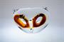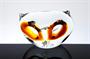 Figurální objekt organických tvarů z masivního čirého a ambrového hutního skla "Sova", který má v průhledu očí otvory. Sova je od pradávna považována za symbol moudrosti. Tvorba z konce minulého století od sklářské výtvarnice - Zdena JOBOVÁ, provedení Crystalex Nový Bor sklárna Chřibská. Dobrý stav, rozměr - š. 17 x 12 x 8cm, hmot. 1,7kg