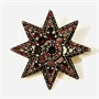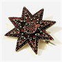 Starožitná brož ve tvaru honosné osmihroté hvězdy, v několika stupních osazeno českými granáty kulatého plochého a routového brusu, efektní kontrast větších (až 4 mm!) a drobných kamenů. Kameny mají jiskrnou barvu, fasováno nýtkovou technikou. Precizní tuzemská granátnická práce z 80. let 19. století s reflexí dobového pseudorenesančního stylu.