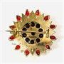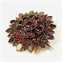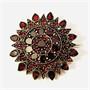 Starožitná brož ve tvaru honosné paprsčité rozety, v několika stupních osazeno českými granáty kulatého a kapkového plochého a kulatého routového brusu, efektní kontrast větších (až 4 mm!) a drobných kamenů. Kameny mají jiskrnou barvu, fasováno nýtkovou technikou a obrumami. Precizní tuzemská granátnická práce z 80. let 19. století s reflexí dobového pseudorenesančního stylu.