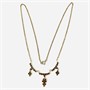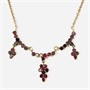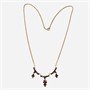 Elegantní, jemnější náhrdelník s ověskovými články osazenými českými granáty kulatého a kapkového plochého brusu, fasováno zrnkovou (vysazovanou) technikou, připojen nepůvodní řetízek vazby "anker". Ozdobná část tuzemskou granátnickou prací z poslední pětiny 19. století.