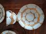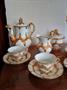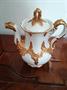 Zlacený servis Meissen - návrh Ernst August Leuteritz vytvořený v letech 1844 až 1855, B - forma, zlacené 23karátovým zlatem, značeno modře podlazurně zkřížené meče. Vystaveno na světové výstavě v Paříži v roce 1867. Kompletní sada - šest šálků a podšálků, konvička, cukřenka, mléčenka v hezkém stavu.