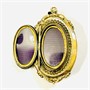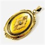 Honosný přívěšek sloužící i jako medailon na fotografie, oválně tělo bohatě plasticky tvarováno a dekorováno ve stylu pozdního biedermeieru. Frontální část v kontrastním lesklém a matovaném zlatavém odstínu, ve středu osazena v zrnité obrubě přírodním diamantem kulatého jednoduchého brusu o váze 0,03 ct, víčko při zadní straně zdobeno jemným gilošováním. Prostor pro fotografie podložen purpurem a opatřen krycími sklíčky. Kvalitní západoevropská zlatnická práce ze 3. čtvrtiny 19. století.