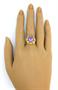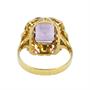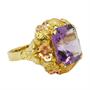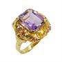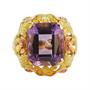 Starožitný prsten s přírodním ametystem, ametyst je orámován gravírovanými lístky a květinami v dvojí barvě zlata. Zlato ryzost 585/1000, punc lvíček, hmotnost 5,72 g, velikost 62. Mistrovská práce ze 40. let 20. století. Šperk ve výborném stavu.