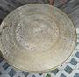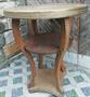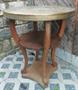 Dubový stolek s mosaznou deskou s ornamenty. Slušný nálezový stav. Rozměry průměr 60cm, výška 70cm.