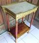 Dřevěný stolek s mramorovou deskou je bohatě zdobený tepaným mosazným plechem. Stolek je v pěkném stavu, nepoškozený, vysoký 78 cm o rozměru 32 x 50 cm. Stolek se hodí jak do haly jako odkládací stolek, tak do ložnice místo toaletky, doplněný o zrcadlo.