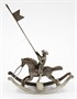 Postříbřená měď a mosaz. Pravděpodobný výrobce: Firma Gebrüder Dingeldein založená roku 1868 v německém Hanau. Figura jezdce na koni z postříbřené mědi a mosazi umístěná na stylizované kolébce. Jezdec drží v pravé ruce praporec. Značeno: nezřetelné značky na boku ohlávky. Německo, Hanau ?, minulé století. Výška s praporcem 9 cm, šířka 7 cm.