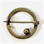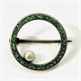 Půvabná menší kruhová brož z období art-deco, rám osazen zářivými zelenými kameny čtvercového brusu, při vnitřní hraně doplněno bílo-šedou umělou voskovanou perlou. Nadčasový design, patrně německá zlatnická práce z 20. až 30. let 20. století.