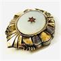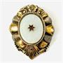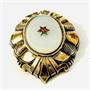 Honosná brož z období pozdního biedermeieru, plasticky tvarované tělo se stylizovanými tvary, volutami a motivem květu, středu dominuje opálové sklo oválného plochého brusu, ve středu v otáčivé hvězdicové aplikaci osazeno rubínovou kulatou muglí. Dekorativní, dobový šperk, kvalitní západoevropská zlatnická práce z konce 60. až 70. let 19. století. Vyrobeno tehdy hojně užívanou technikou foukaného kovu.