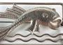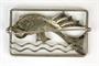 Brož zdobena reliéfem ryby ze stříbra ryzosti 800/1000. Mistrovská značka JŘ. Puncováno. Rozměry: 5,2 x 3 cm. Celková hmotnost: 10,76 g. Čechy, 1930.