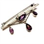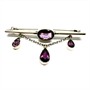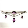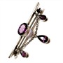 Jemná, velmi půvabná stříbrná brož. Šperk byl zhotoven počátkem 20.století v secesním duchu a zdobí jej fazetově vybroušené ametysty sytého odstínu. Stříbro ryzosti 800/1000, celková váha 3,23 g. Rozměry 4,5 x 2 cm. Výborný stav.