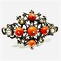 Velmi stará, výrazná brož z prořezávaného stříbra. Šperk zdobí pět velkých, kulatě broušených korálů. Ty mají sytý, intenzivní červenooranžový odstín. Dále je brož osazena šesti říčními, bílými perlami. Sterlingové stříbro (925/1000), jehla obecný kov. Celková váha 13,57 g. Rozměry 4,5 x 3 cm. Perfektní stav.