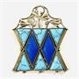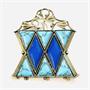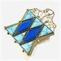 Nepřehlédnutelná větší brož, jež je replikou dle zlatého závěsu z dílen Střední uměleckoprůmyslové školy v Turnově z počátku 20. let 20. století. Tělo složeno z přísně kladených geometricky tvarovaných kamenů uložených v zrnitých obrubách, dvou homogenně tmavě modrých přírodních lapis lazuli ve tvaru kosodélníku a šesti přírodních trojúhelníkových tyrkysů s výrazným žilkováním. Štít je tvořen vzdušnou plastikou s motivem stylizovaných stonků a listů. Po obvodu ozdobeno kuličkami, které se opakují i ve zmíněné plastice a propojují tak obě části brože do esteticky jednotného celku. Výjimečný, originální autorský šperk vysokých uměleckých kvalit, mistrovská klenotnická turnovská práce z 90. let 20. století.